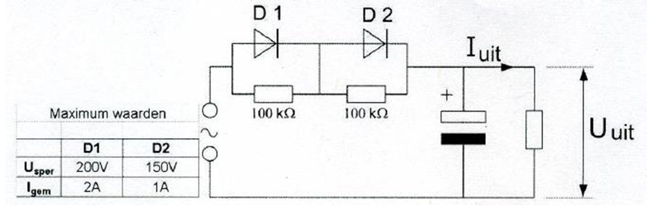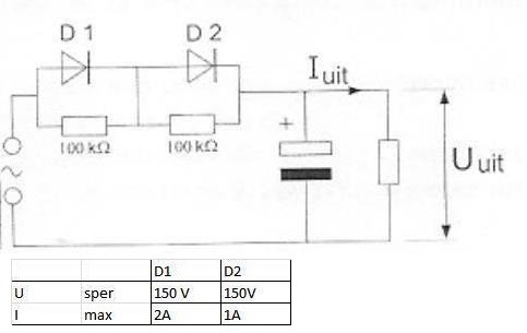 Umax over de dioden is 150V per stuk , serie dus totale maximale spanning= 300 V
