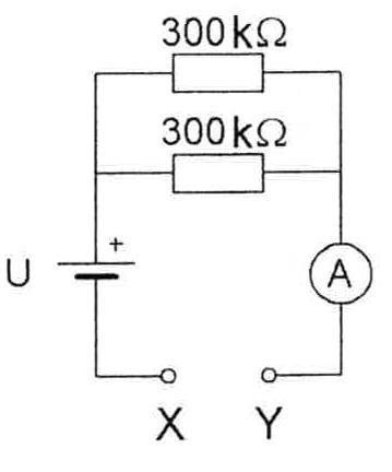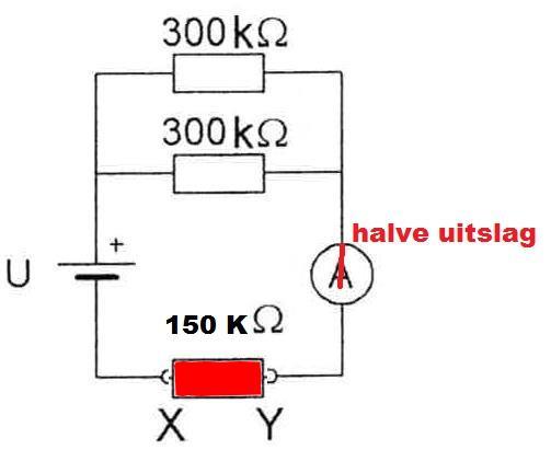 De uitslag halveert bij aansluiten van een weerstend tussen X en Y met een waarde van