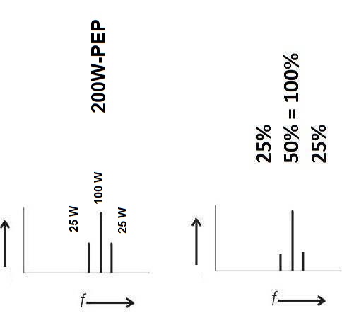 Het frequentiespectrum van een HF-signaal dat 50 procent gemoduleerd is met 1 constante lf-sinustrilling vertoont