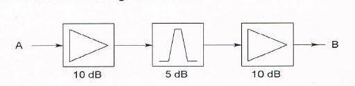 Immers de versterkers versterken en het filter verzwakt. dus +10-5+10=15 dB