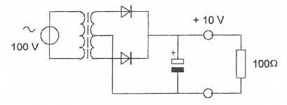 Van een dubbelfasige gelijkrichter is de uitgangsspanning 10 volt bij een belasting met 100 ohm.