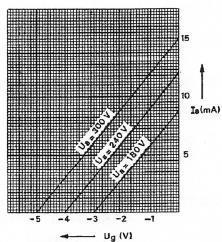 Van een penthode, ingesteld in de klasse A, is het verband tussen Ia en Ug gegeven