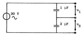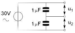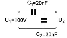 Op de schakeling van twee ideale condensatoren wordt een sinusvormige spanning U1 van 100 volt aangesloten.