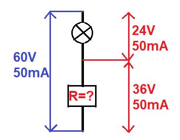 Een gloeilamp van 24 V en 50 mA wordt via een weerstand aangesloten op een spanning van 60 V