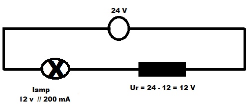 Een gloeilamp van 12V//200mA wordt met behulp van een voorschakelweerstand aangesloten op een spanning van 24V