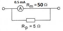 Aan een mili-amperemeter met een eigen weerstand van 50 Ohm en een meetgebied van 0.5 mA wordt een weerstand van 5 Ohm parallel geschakeld.
