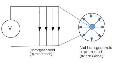 In een homogeen veld (homogeen betekent: overal hetzelfde) is de elektrische veldsterkte onafhankelijk van de positie waar we meten. Bij een niet homogeen veld is de veldsterkte plaats afhankelijk. In de coaxkabel zien we dat de veldlijnen bij de binnenader een hogere concentratie hebben dan bij de buitenmantel. Dit veld is dus niet homogeen.
