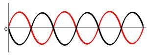 Als de 2 golven wel tegelijkertijd door de nul gaan, maar de een is positief terwijl de andere negatief is, dan spreken we van tegenfase. boven zie je 2 golven, een rode en een zwarte.