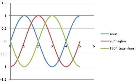 De rode lijn ijlt 90 graden na, bij 1 op de X-as heeft de blauwe sinus de 90 graden bereikt, terwijl de rode lijn dan nog maar op 0 graden zit, een faseverschil van 90 graden.