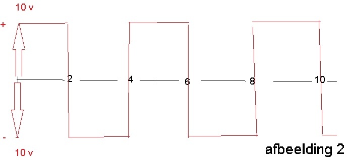 Als we een gelijkspanningsmeter zouden aansluiten zou hij afwisselend 10 Volt en -10 Volt aanwijzen.