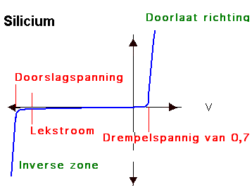 De drempelspanning is niet voor iedere stof gelijk. Voor silicium is dit 0,7V en voor germanium 0,2V.