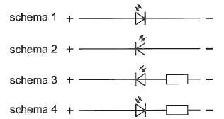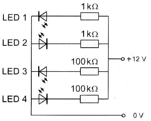 Een LED (light emitting diode) dient op een spanning van 12 volt te worden aangesloten: