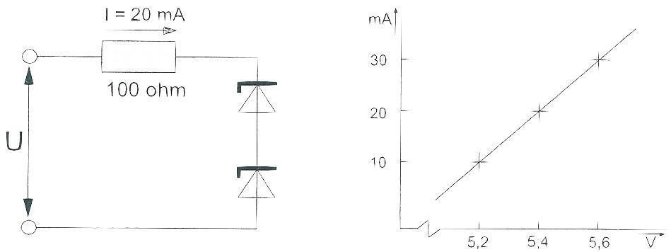 Van de gelijke zenerdiodes is de karakteristiek gegeven.