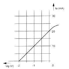 Van een pentode, ingesteld in de klasse A, is het verband tussen !a en Ug aangegeven bij een anodeweerstand van 5000 Ohm