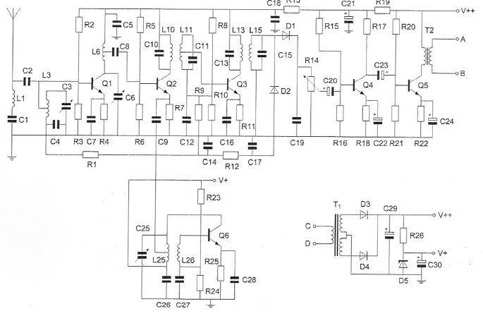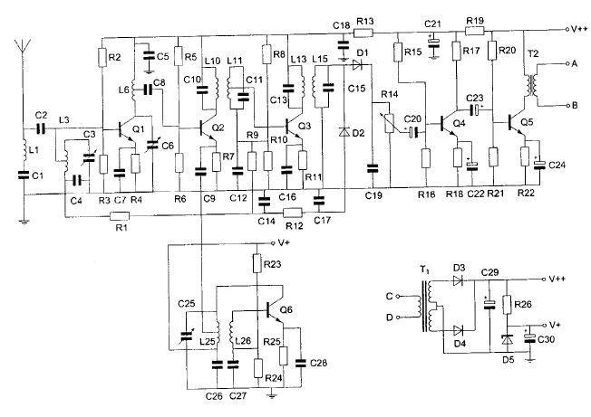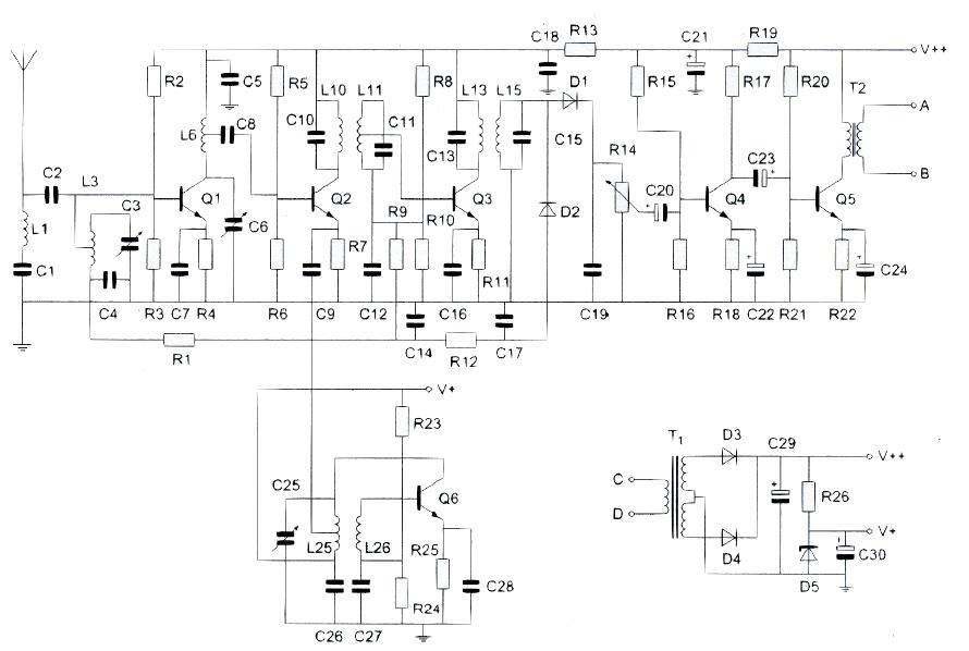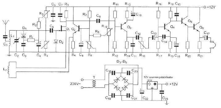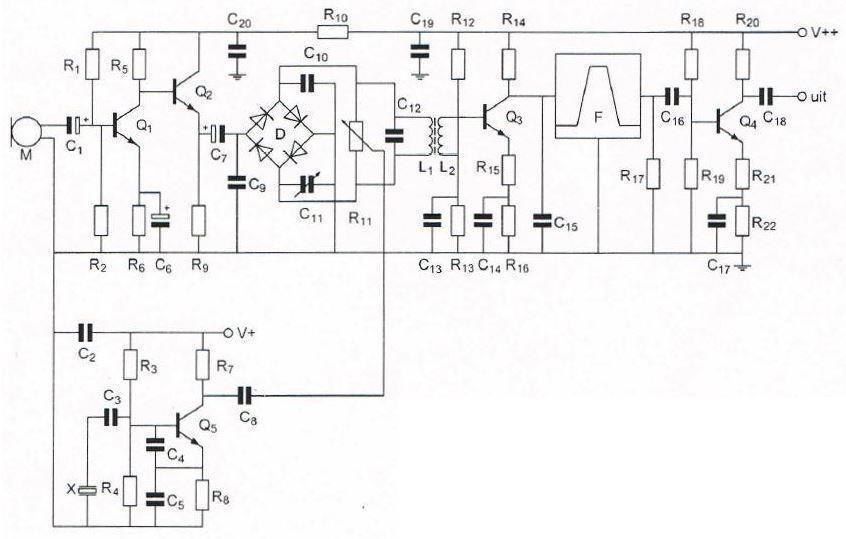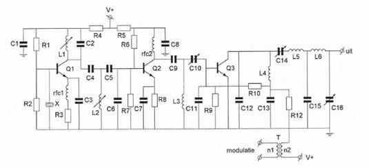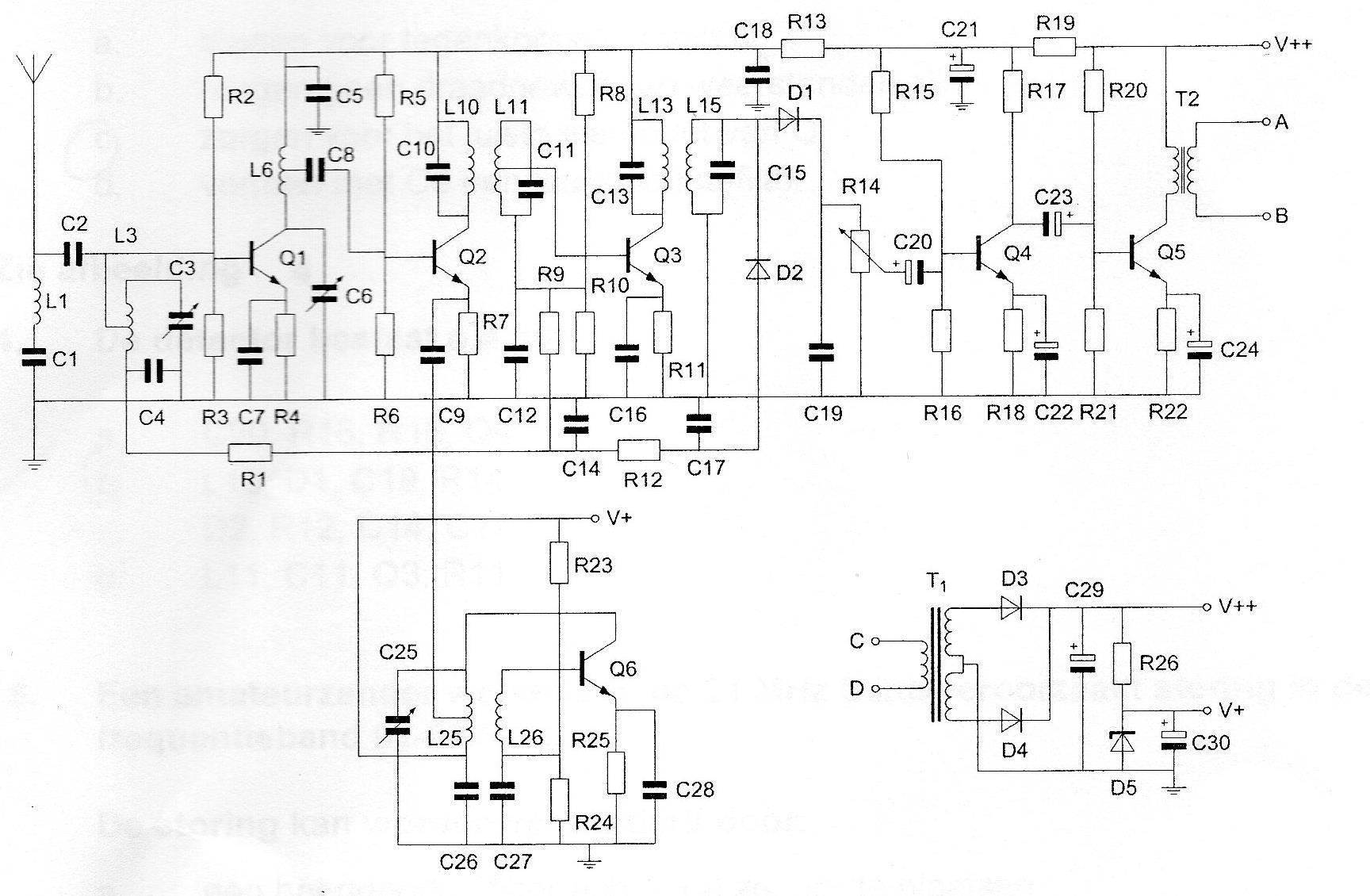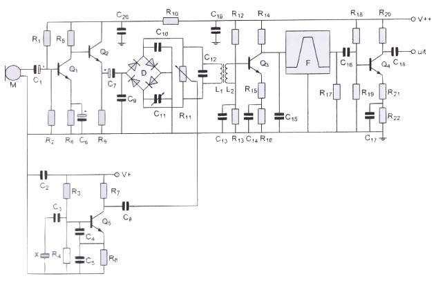 De hoogfrequentversterker is opgebouwd rond transistor: