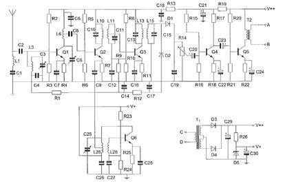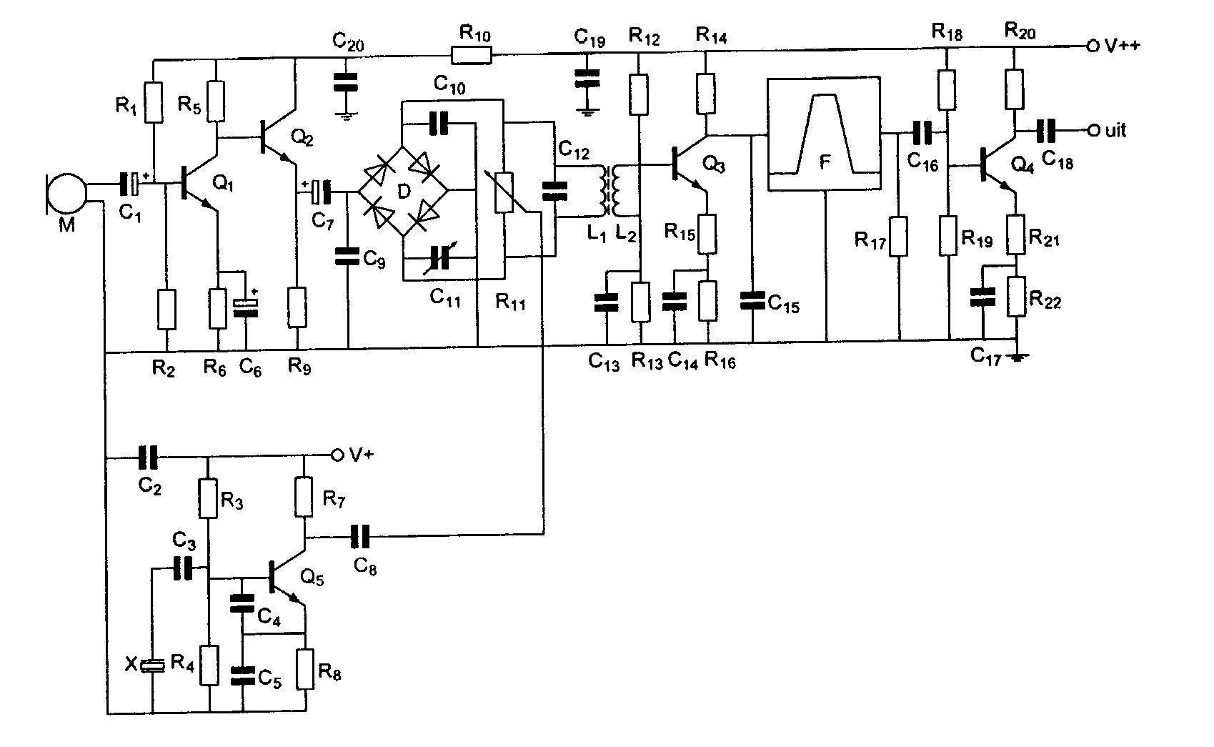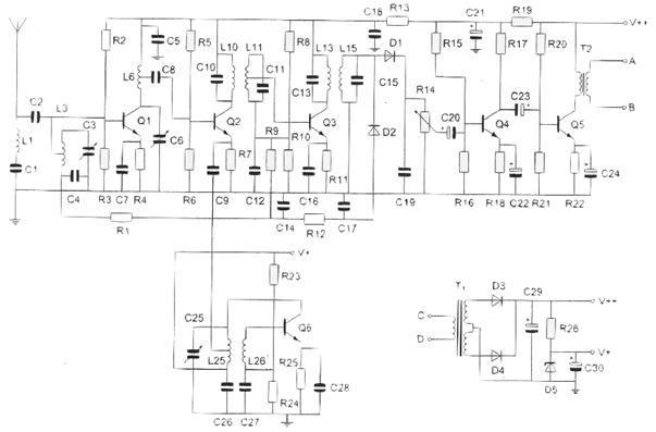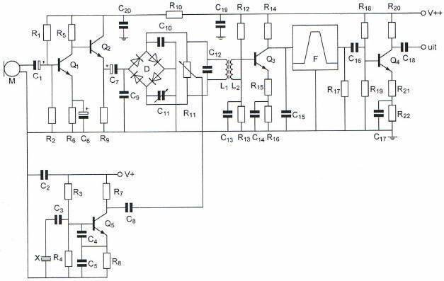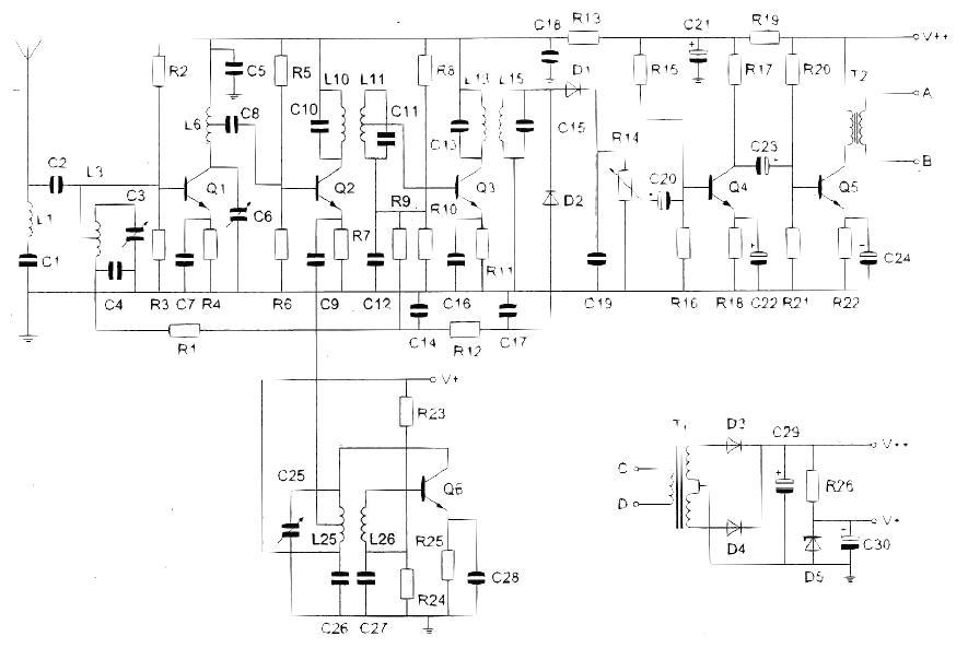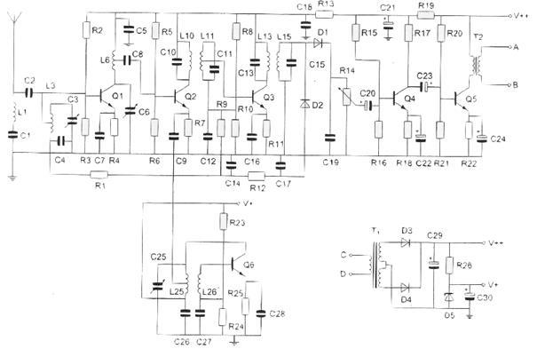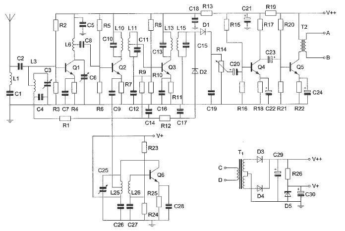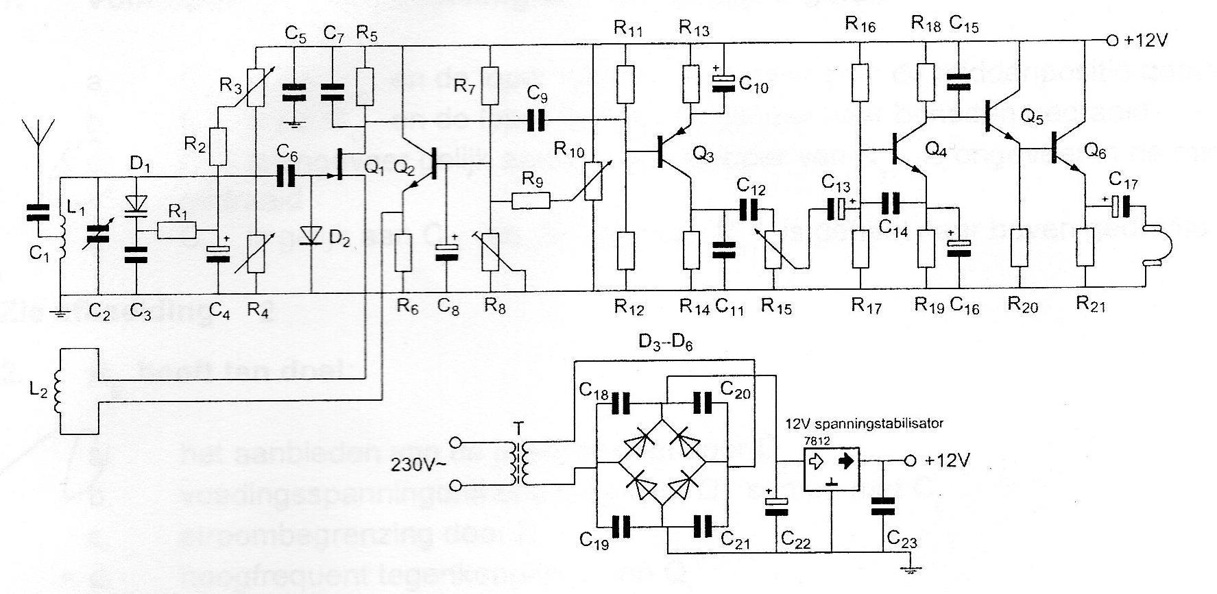 De hoogfrequentversterker is opgebouwd rond transistor: