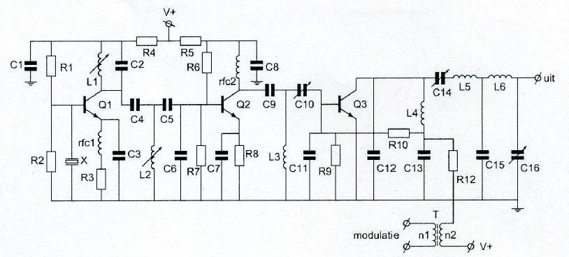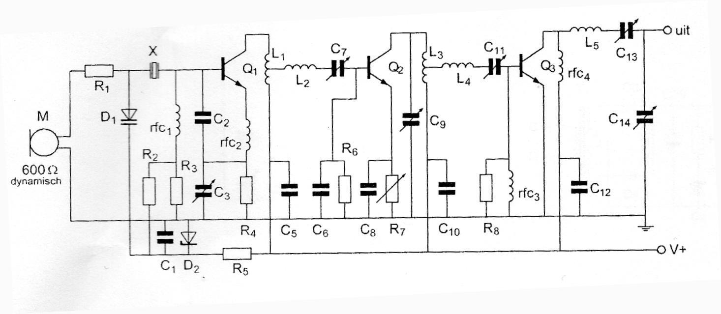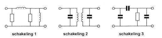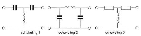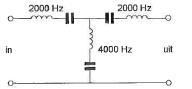In het filter zijn 3 seriekringen in resonantie op de daarbij aangegeven frequenties,