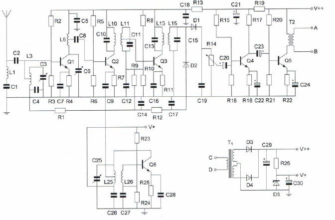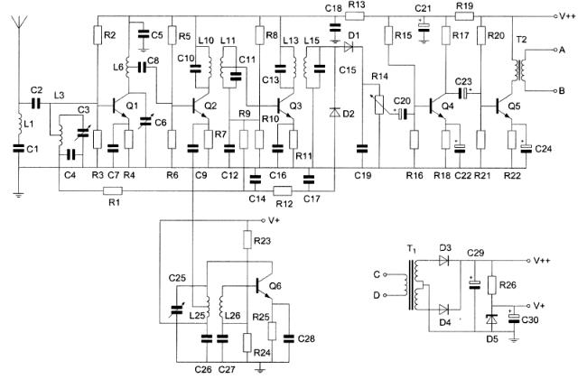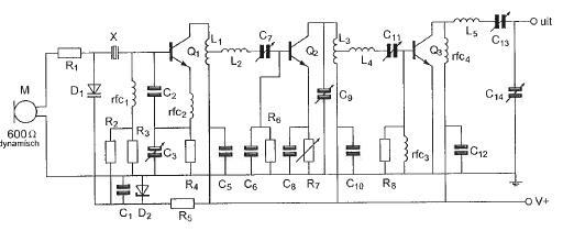LF-detectie wordt voorkomen door toepassing van een weerstand van ongeveer 500 Ω in de basisleiding van de 1ste transistor en een C naar aarde.