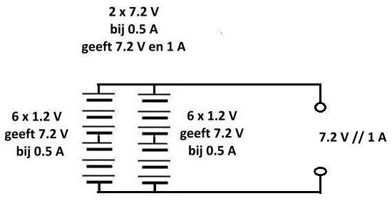 Een batterij is opgebouwd uit oplaadbare cellen van 1.2 V en een capaciteit van 0.5 Ah