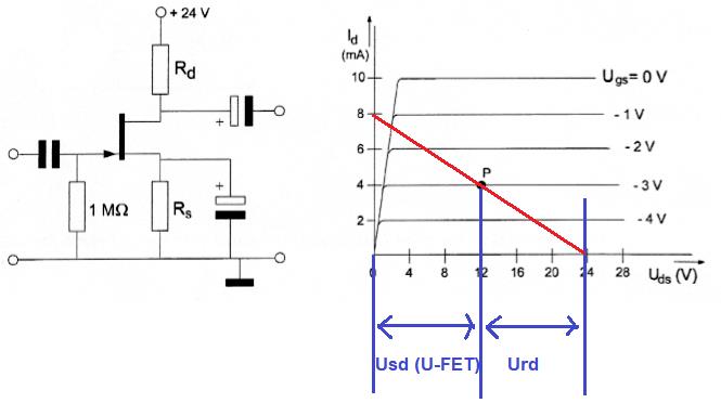 Bij een FET wordt de werkpuntinstelling voor gelijkspanning bepaald door Rs.