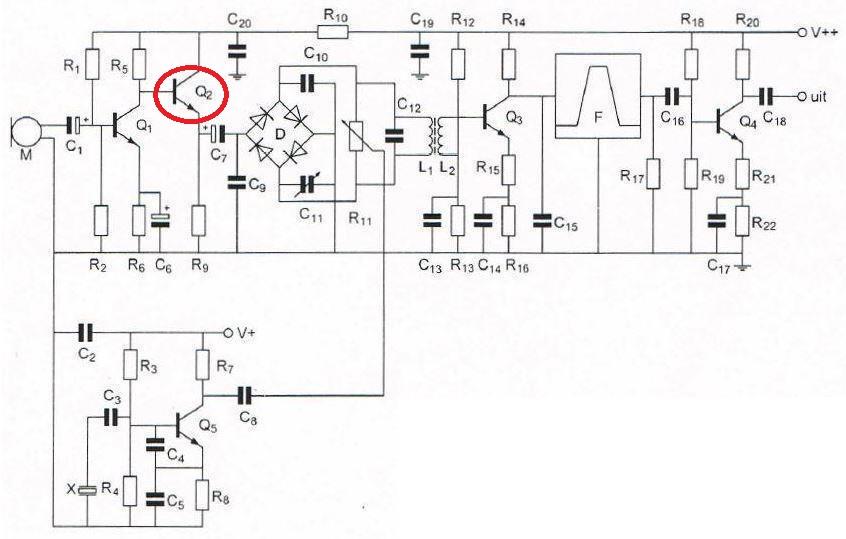 Q2 wordt gebruikt als laagfrequent scheidingstrap/buffer versterker