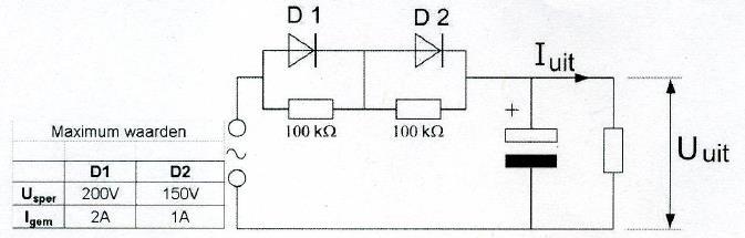 Bij een diode staat de spanning van de trafo en elco in serie bij de negatieve helft van de wisselspanningsperiode en dus is de diode belastbaar met zijn halve maximale spanning.