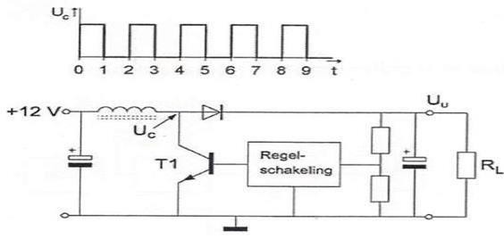 Als deze transistor afschakelt, stopt de stroom maar zal de spanning over de spoel oplopen door de energie die nog in de spoel zit.