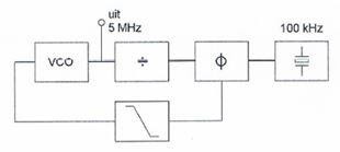 Om de frequentie van 5 MHz uit de VCO te kunnen vergelijken met de referentiefrequentie van 100 kHz, moet de deler 5 MHz : 100 kHz = 50 zijn.
