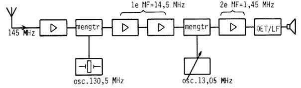 08 http://www.iwab.nu/H4-098.html In de figuur is het blokschema van een 2 meter ontvanger (dubbelsuper) weergegeven. Wat is de minimale bandbreedte van het 1ste MF?