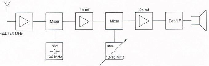 06 http://www.iwab.nu/H4-097.html In het schema is in blokvorm een 2-meter ontvanger (dubbelsuper) gegeven. Als het ontvangen signaal een frequentiezwaai heeft van 3 Khz dan bedraagt de frequentiezwaai in de 2de mf-versterker:
