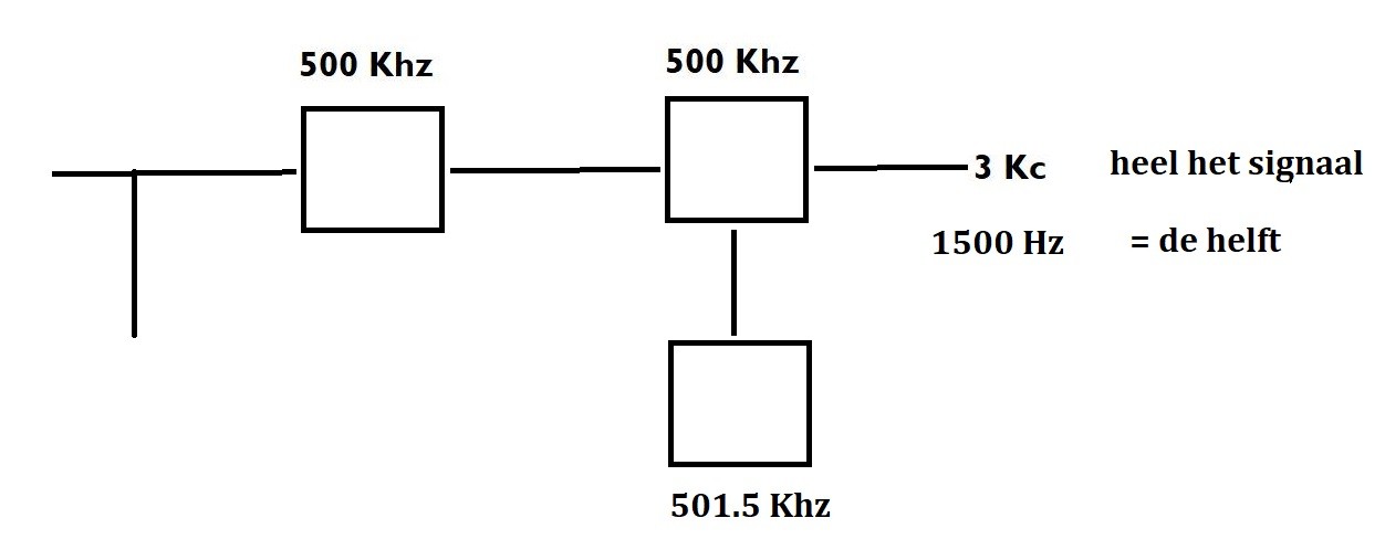 55 http://www.iwab.nu/H4_025.html Een hf-ontvanger heeft een mf-versterker op 500 kHz (centrale frequentie) met een bandbreedte van 3000 Hz. Om een J3E bovenzijbandsignaal in de 20-meter amateurband te ontvangen is de 1ste oscillator ingesteld op 14,7 MHz. Voor optimale verstaanbaarheid wordt de hulposcillator (BFO) ingesteld op: