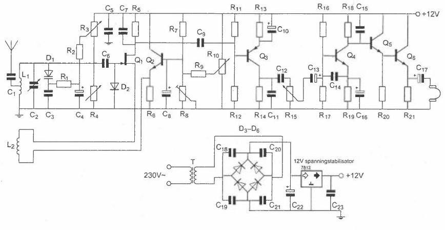 a afvlakschakeling : afvlakschakeling onjuist want C22 (=elektrolytische condensator) verzorgt afvlakking b bruggelijkrichter . bruggelijkrichter juist want is een schema van een AM ontvanger c balansmodulator balansmodulator onjuist want deze zit in een SSB zender en heeft de diodes allemaal in gelijke richting d enkelzijdige gelijkrichter enkelzijdige gelijkrichter onjuist want die bevat meestal 1 diode, die een helft van de wisselspanning pakt.