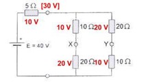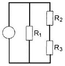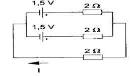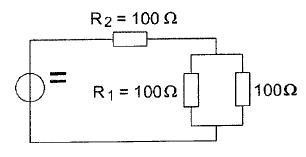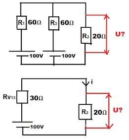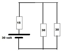 Een batterij met een inwendige weerstand van 15 ohm en een bronspanning (EMK) van 30 volt wordt aangesloten op een parallelschakeling van 2 weerstanden van 30 ohm.