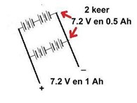 Voor de spanning 7.2 / 1.2 = 6 dus minimaal 6 cellen van 1.2 V geeft 6 x1.2 = 7.2 V
