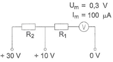 Voor het verkrijgen van een 10V- en een 30V-meetgebied moeten R1 en R2 zijn: