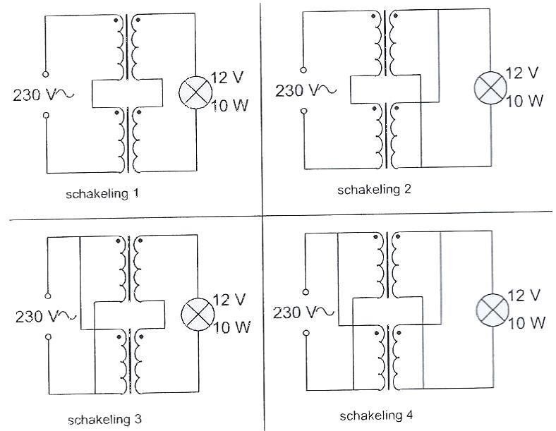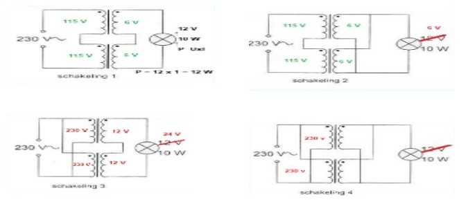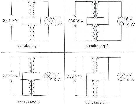Er staan twee gelijke trafo’s ter beschikking van elk primair 230V en secundair 6V/1A.
