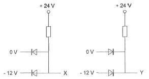 Om te kunnen geleiden moet de ingang positief zijn t.o.v. -36V.