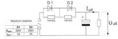 Umax over de dioden is 150V per stuk , serie dus totale maximale spanning= 300 V