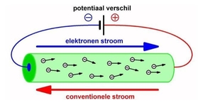 Jaren later bleek er een elektronenstroom van - naar + gaat, dit heet de elektronenstroom.