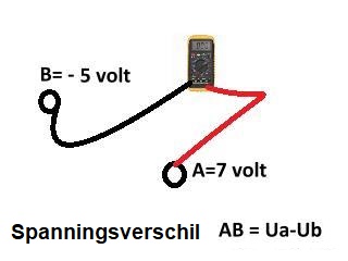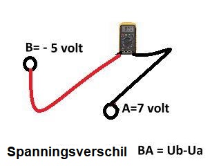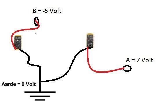 Op punt A staat 7 Volt en op punt B staat -5 Volt