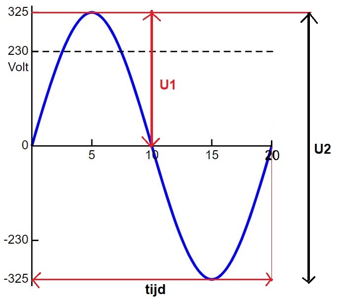 De topwaarde x 1/2√2 = topwaarde x 0.707 = de eff waarde 230 V en dus niet de amplitude