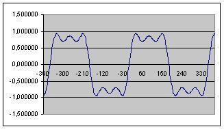 Een symmetrische blokgolf is ook te maken door een aantal sinusvormige signalen samen te voegen.