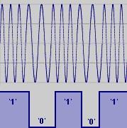 Deze data is binaire data en heeft 2 mogelijke toestanden, een logische '0' resulteert in een lagere frequentie, een logische '1' geeft een frequentie die hoger is dan de oorspronkelijke draaggolffrequentie.