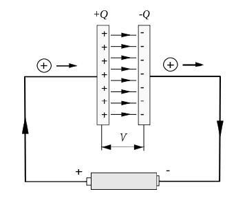 De condensator is verbonden met een staafbatterij waardoor de platen van de condensator geladen zijn met elektrische ladingen +Q en −Q, wat gepaard gaat met een elektrisch veld (pijltjes) tussen de platen