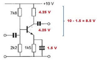 Onze beschikbare spanning voor versterking = 8,5V (10V – 1,5V verlies op de emitter weerstand).