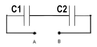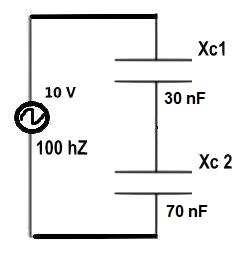 De Condensatoren staan achterelkaar en hebben dezelfde stroom.