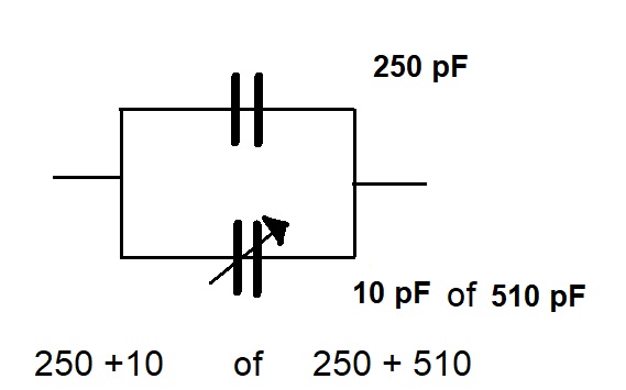 In een kring wordt aan de vaste condensator van 250 pF een afstemcondensator, met een minimum van 10 pF, parallel geschakeld.