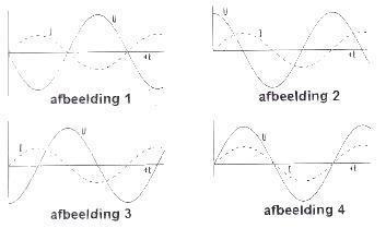 De spanning loopt 90graden in fase achter op de stroom in---