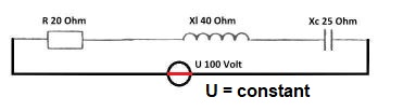 De stroom zal I = U/Z zijn 100/25 = 4 Amp , door heel de schakeling.