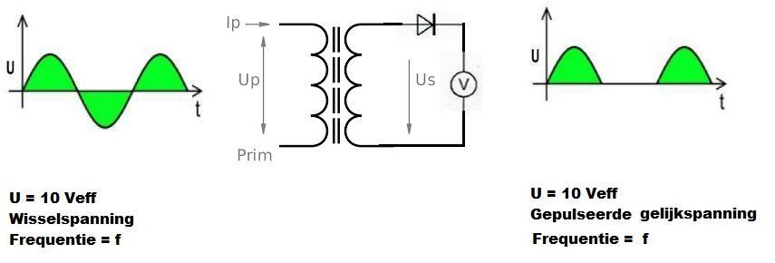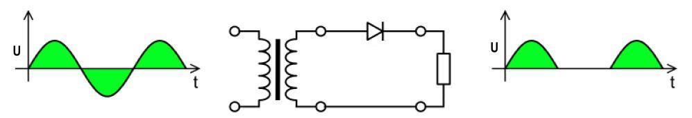 Enkelzijdige gelijkrichting, met 1 diode, zonder condensator , alleen de bovenste helft van de sinus blijft over.